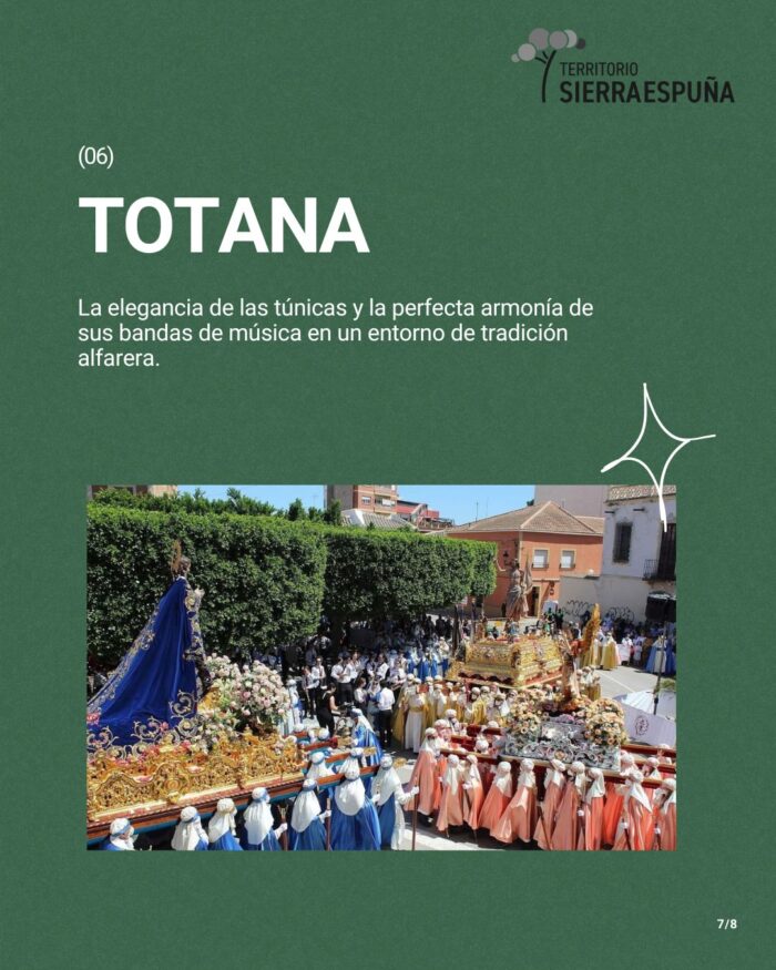 Totana vive estos días con una elegancia singular. Sus nazarenos, con sus túnicas perfectamente almidonadas, escoltan imágenes de una calidad artística excepcional. Todo gira entorno a la túnica negra, que uniformiza a toda una población, signo de identidad de todo un pueblo desde el siglo XVII, siendo esta la vestimenta que los regidores se ponían para participar en los actos de duelo. El sonido de las bandas de música locales, de gran tradición, acompaña los desfiles por las plazas donde el barro y la alfarería son el alma del pueblo, dándole un carácter señorial único.
